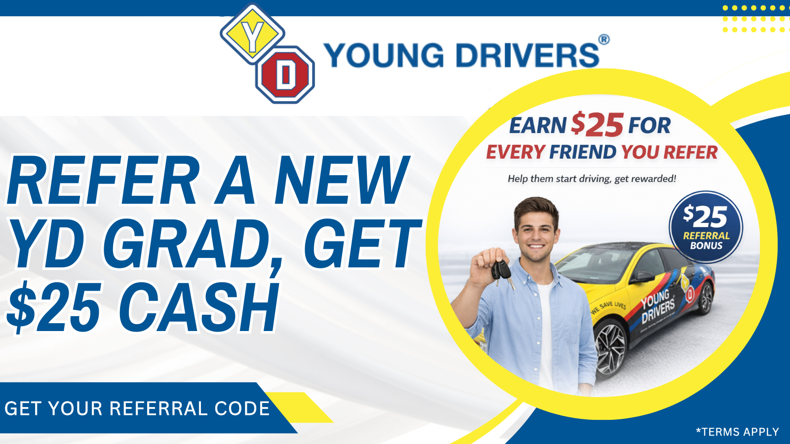 Know someone who’s ready to start driving? Refer them to Young Drivers and earn $25 cash when they purchase a full driving course! It’s a simple way to help your friends and family become safer drivers—and get rewarded at the same time. The more people you refer, the more you can earn.